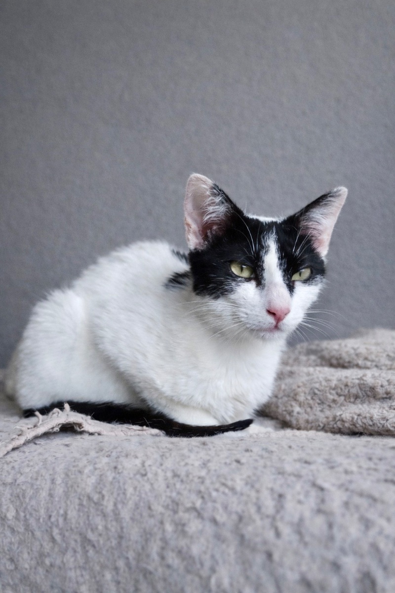 Esta pequeñaja llegó a la asociación con una infección respiratoria y muy baja en peso. Pero su casa de acogida la arropó y con amor, antibióticos y mucha comida, está preciosa. Es una gata independiente, aunque le gusta que la acaricies.